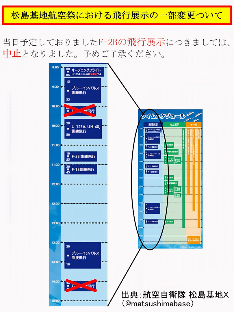 なお、予定されていたF-2B戦闘機の飛行展示については、すべて中止された。