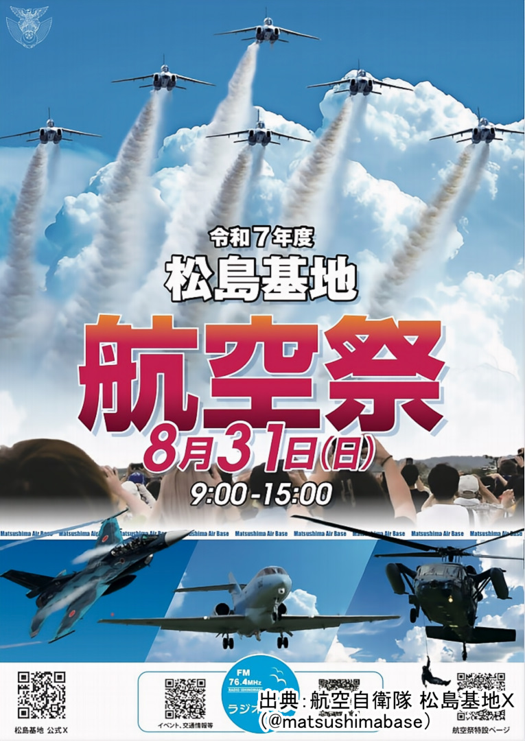 航空自衛隊松島基地は、宮城県東松島市に所在。F-2戦闘機のパイロットを養成する第4航空団隷下の第21飛行隊。航空自衛隊の存在を多くの人に知ってもらうために展示飛行を披露する専門のチームである「ブルーインパルス」も、同じく第4航空団隷下の第11飛行隊が所属している。