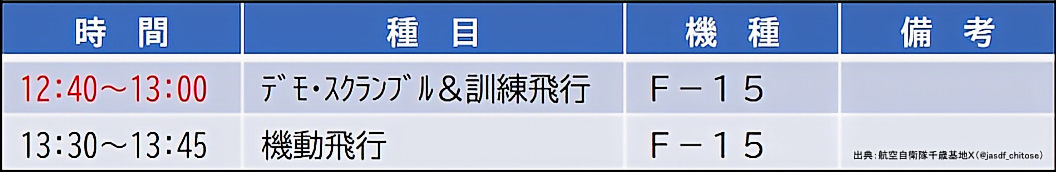 第201飛行隊のF-15J戦闘機による機動飛行が予定されていたが、残念ながら天候不良により中止された。