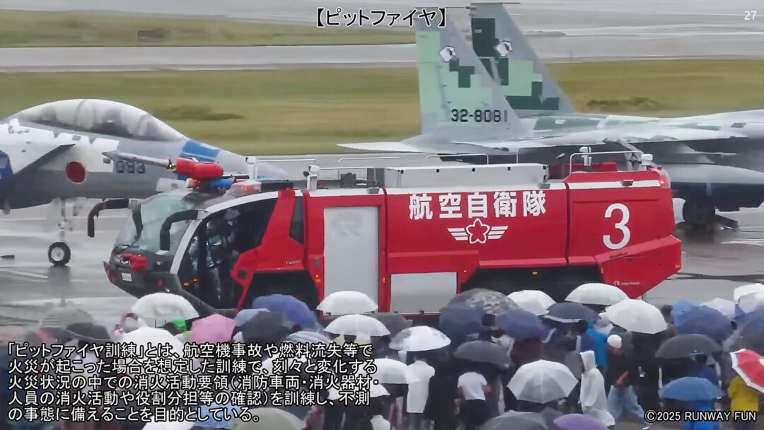 施設隊消防小隊が「ピットファイヤ訓練」の一部を披露した。
