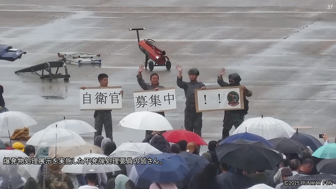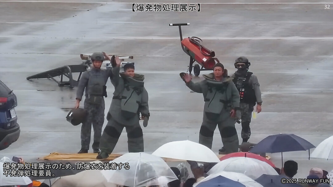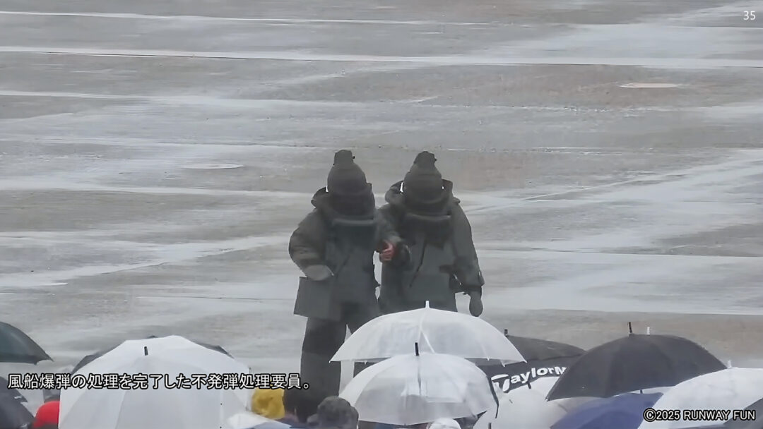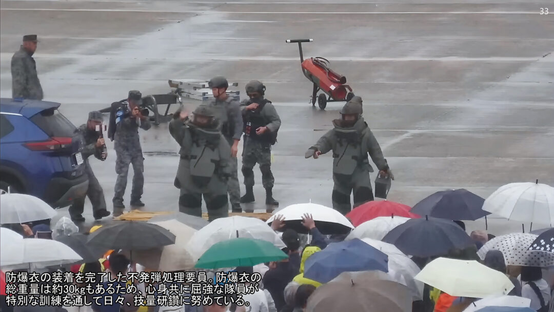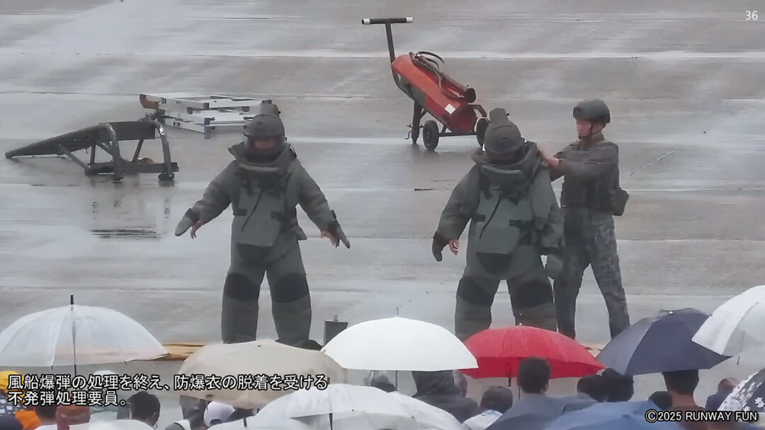 第6航空団の「不発弾処理要員(EOD:Explosive Ordnance Disposal)=爆発物処理」が、爆発物(風船爆弾)の処理過程を披露した。